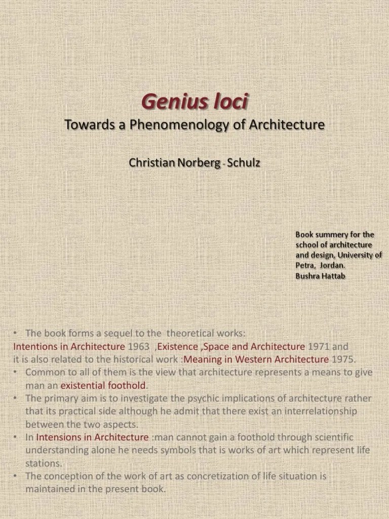Genius loci deals with the combination of two very different elements, nature and people... . Norberg schulz was the first to translate heidegger's ideas on phenomenology in to architecture related intent.